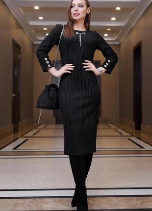 Сделайте свой выбор в пользу классического черного платья. Приталенный силуэт и разрез, который выполнен сзади изделия, подчеркнут достоинства вашей фигуры. Изюминкой модели являются хольнитены на рукавах и полочке изделия. Наряд отличает рукав ¾, потайная молния и круглый вырез на горловине. Материал эко- замша обязательно вас порадует в демисезонный период своим комфортом и практичностью.