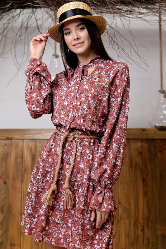 Купить пояс можно здесь С платьем можно купить многоразовую маску здесь Интернет-магазин Seventeen презентует модную новинку этого сезона невероятно женственное и романтичное платье терракотового цвета с нежным и утонченным цветочным принтом. Главными декоративными акцентами модели стали пышные рукава амадис, которые внизу заканчиваются сборкой манжета резинкой и свободным краем, а также необычная горловина с воротником-бантом. Линию талии оригинально подчеркивает пояс в эко-стиле. Рюша на юбке обеспечивает модели дополнительную непосредственность и легкость. Платье пошито из принтованного штапеля.