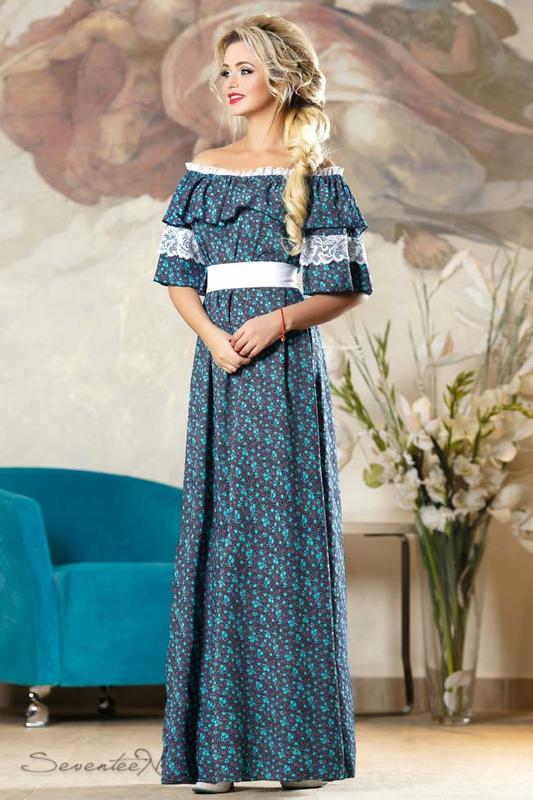 Оригинальная модель летнего платья в пол. Удачно сочетает в себе вырез анжелика декорированный узкой кружевной полосой и широкой оборкой по нижнему краю, из которой как бы вытекают свободного кроя рукава до локтя с элегантными ажурными кружевами из натурального материала. Образ выглядит довольно элегантно и нарядно. Мягкий стрейч синего цвета с мелким бирюзовым принтом идеально гармонирует с белоснежным кружевом и пояском. Модель подчеркивает вашу женственность, мягкость, нежность, кокетливость и игривость образа. Красота и элегантность платья не останутся без внимания как женской, так и мужской половины общества, оно как магнитом будет притягивать взоры романтичных мужчин. В этом наряде легко можно себя почувствовать героиней романа. Купить эту прекрасную модель летнего платья относительно недорого предлагает интернет магазин SEVENTEEN, который реализует продукцию оптом и в розницу по доступной цене. Доставка осуществляется по Украине, в др. страны.. Материал: принтованный софт Длина изделия по спине: S-M = 143 см, L-XL = 145 см. Длина рукава: S-M = 25 см, L-XL = 27 см. Цвет: Сине-бирюзовый Внимание!