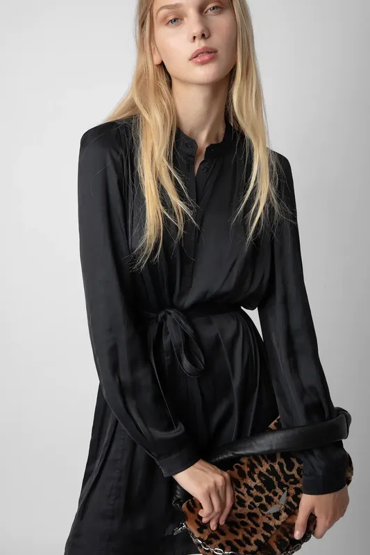 Женское короткое черное атласное платье - Круглый, застегнутый воротник - Собранные детали и складки сзади - Съемный ремень - Длинные рукава и манжеты на пуговицах. Состав 57% ПОЛИЭСТЕР** 43% ПОЛИЭСТЕР
