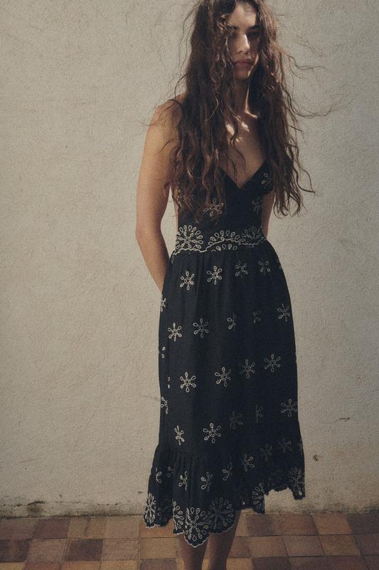 Платье средней длины. V-образный вырез. Тонкие лямки, регулируемые по длине. Перевязка сзади. Контрастная ажурная вышивка. Облицовка. Потайная застежка-молния на линии бокового шва. ОСНОВНА ТКАНИНА 100% бавовна ВИШИВКА 100% полиэстер