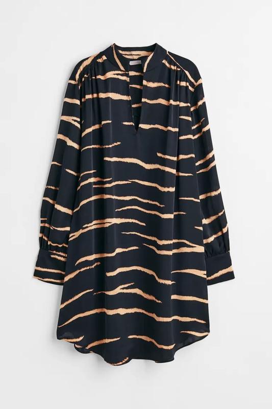 Очень красивое сатиновое платье в анималистичный принт известного шведского бренда H&M. Платье из последних коллекций. Выполнена в стиле туники свободного кроя с длинными объемными рукавами и V-образным декольте. Манжеты рукавов на пуговицах. Круто смотрится на теле - соответствует фото на модели. Материал гладки приятный на ощупь. Длина до колен. Низ изделия закруглен Состояние: идеальный (как новая - без дефектов или нюансов) Размер: S, можно также на М за счет свободного кроя Состав: 100% полиэстер Замеры и любая дополнительная информация по запросу.