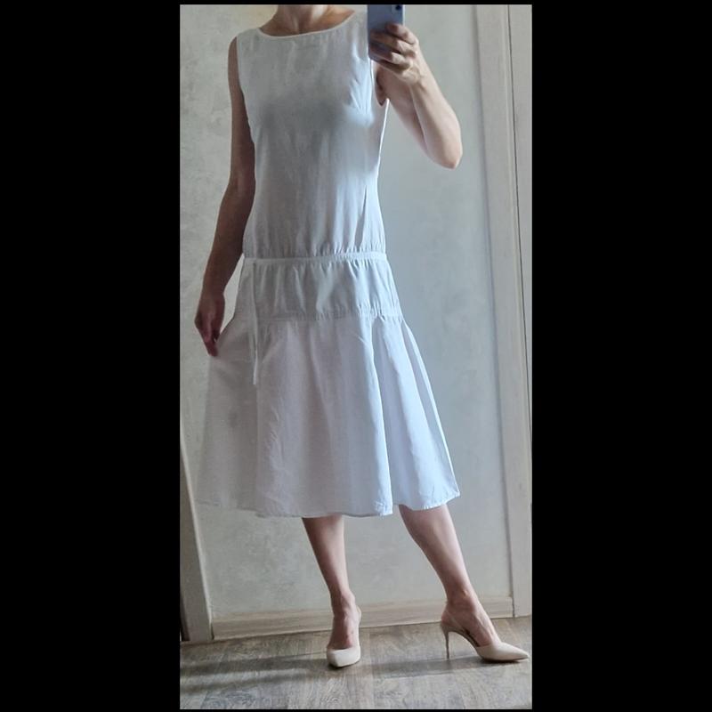 Белое льняное платье миди Marc O'Polo, размер S, можно и на М. Надежно на рост 165см размер М. В области нижнего белья на бедрах двойная ткань, поэтому там нет просвета, что является удобством носить платье без дискомфорта. Состояние новой вещи. Пог 48 Пот 42 По стегон 53 Длина 107 Отправлю безопасной доставкой