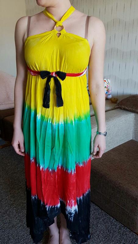 Яркий, легкий летний сарафан. Ассиметричный низ. Шлейки завязки можно завязывать в нескольких вариантах. Покупался в Индии. Размер 46-48.