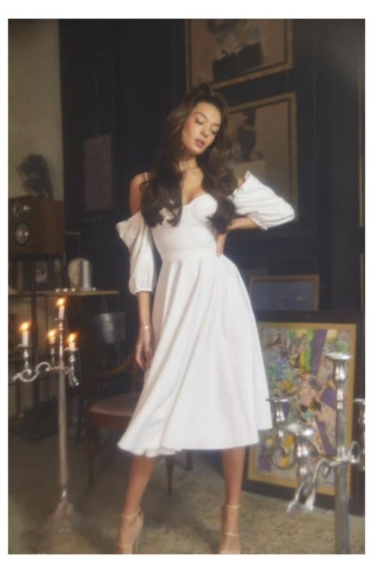 Вечернее платье на бретелях с чашечками. Стан - нова Цвет - белый Размер - М(38) Длина - миди Длина рукава - три четверти Состав - 65% хлопок, 35% полиэстер Платье не одевалось ни разу