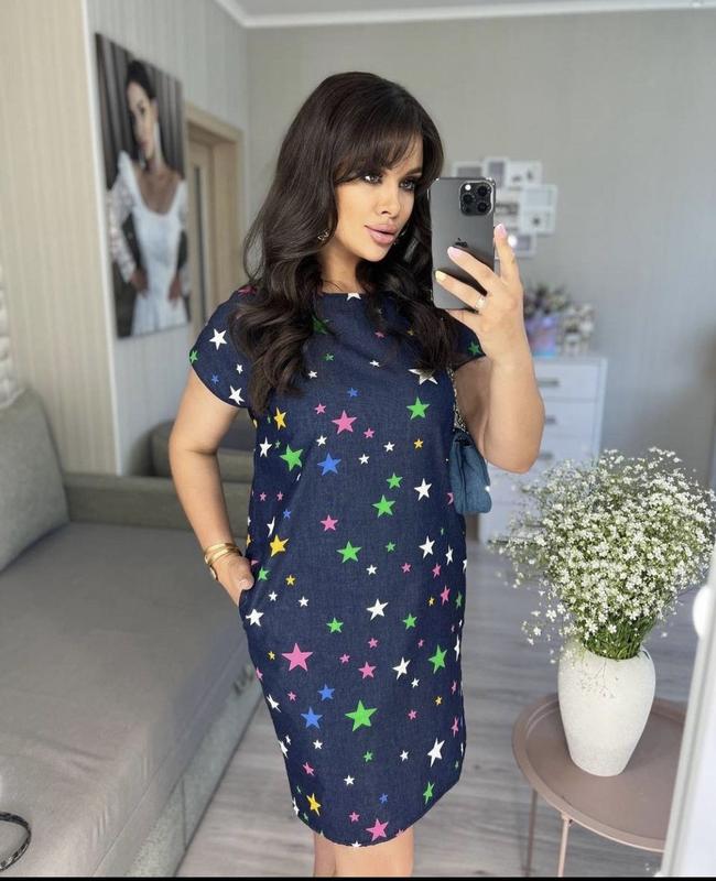 Платье цветом джинс с принтом Размер производителем указан 60, но ориентируйтесь на замеры: - объем комди 128 см - объем бедр 130см - длина от плеча 97 см