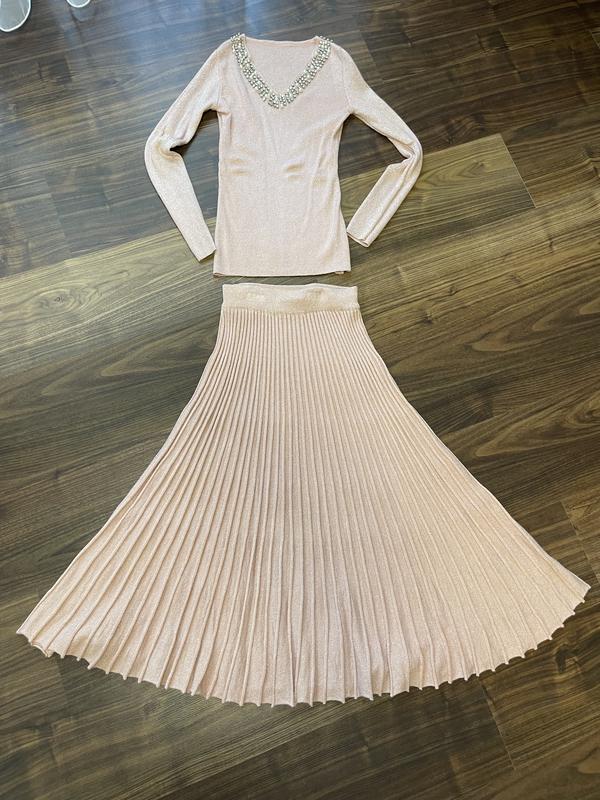Очень нежный костюм. Размер хс, с. Верхняя кофточка хорошо тянется. Все камушки на месте. Юбка плиссе. Подойдет на праздник и на каждый день.