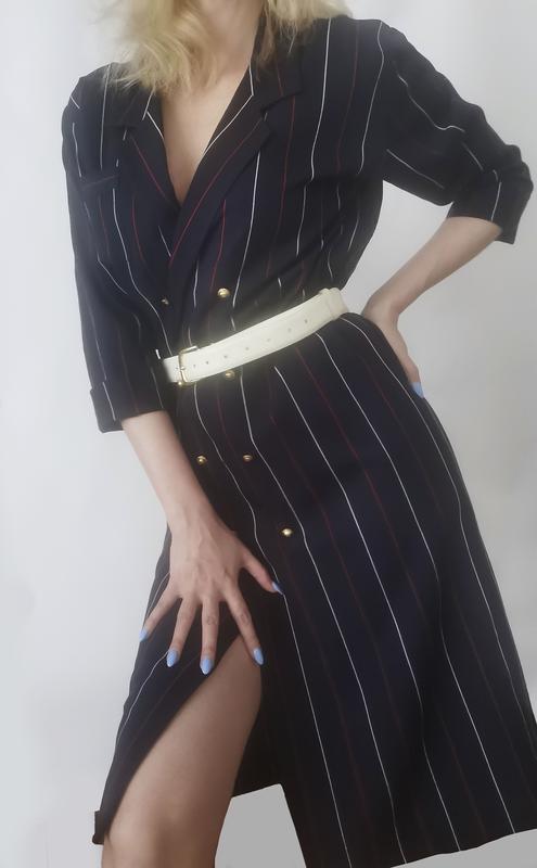 Шикарное платье из мягкой шерсти, темно синяя в красную и белую полоску. Склад тканини на фото. Злотчатые пуговицы, можно носить под поями, чтобы подчеркнуть талию, а можно и без, оверсайз под кроссы. Сидит очень женственно и сексуально. для офиса то, что нужно. Подойдет на бедра до 103 см
