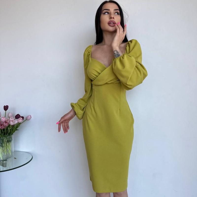 Платье миди по фигуре с декольте на запах с пышными рукавами фонариками буфами приталенное...