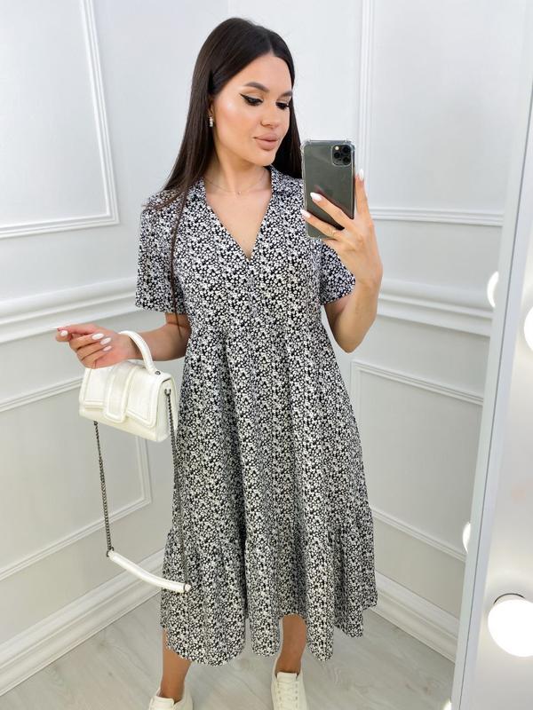 185 Новинка! Платье Мод. 052 Ткань: еврософт Принт мелкий Цвет: чёрный, серый, зелёный Размер 42-44, 46-48, 50-52 Модель с воротничком, коротким рукавом на груди застёгивается на две пуговицы