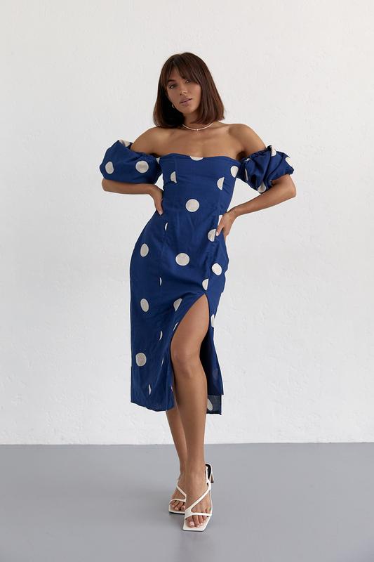 Женское платье миди в горох с открытыми плечами и разрезом.