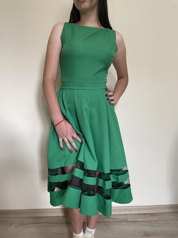 Платье зеленого цвета, немножко темнее чем на фото. Размер S, M, застегивается на молнию сбоку. Подробные замеры снабжам в сообщения.