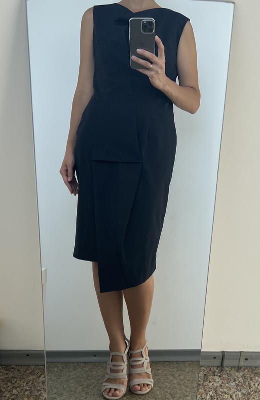 Платье миди интересного асимметричного кроя. Размер указан L, но подойдет и на М. Платье без подкладки. Цвет темно синий, почти черный. Длина от плеча 100/111, плечи 41, ПОГ 45, талия 41, бедра 49