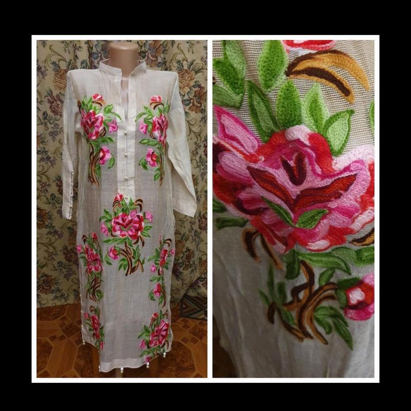 ЗАМІРИ, ОПИС, ОПЛАТА, Доставка ⬇️ ⬇️ ⬇️ УКРПОШТА!!! 💯% оплата на карту НОВА ПОШТА Безпечна оплата Повна оплата на карту МЕЕСТ 💯% оплата на карту Ручна робота без бірок сукня туніка прикрашена шикарною вишивкою та перлами плотна але мяка тканина незвичайно приемна колір насичений стан нової не вдягалася чудово виглядае з легкими брюками кюлотами білого або бежевого коліру виміри в полуобьеме, в спокійному стані розмір виробника 12/38/М добре сідае на наш на наш 44-46 оріентуйтесь по замірах тканина зовсім злегка тягнеться плечі 37 в рукав 48 ог 51 ( на ог до 98 см) об 57, повинні сісти вільно, до 105-106 см довжина 103 без застібок, блискавок обміну або повернення немає