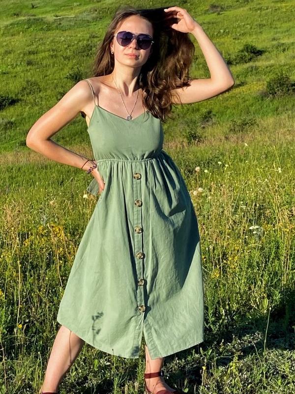 Сарафан довжини міді, з відкритою спинкою на завʼязці, має ґудзики та підкладку На фото на параметрах 90-65-92 Зріст 168см Стан ідеальний, підривала трішки бретельки бо вони не регулюються