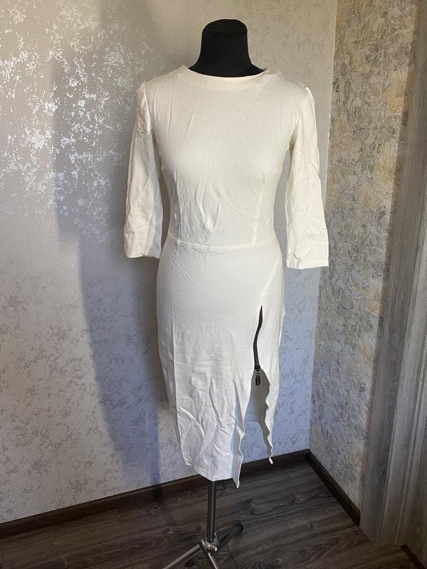 Осеннее миди платье молочного цвета с рукавами и с разрезом