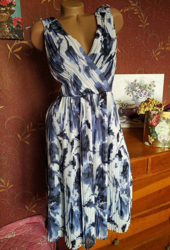 Шикарна сукня міді гофрована, приталена з яскравим принтом, з розкльошеною спідницею. Сукня відмінної якості в ідеальному стані 👌 Тканина м'яка, приємна до тіла, нагадує шифон Заміри по сукні: Пог 53 Пот 43 Поб 60 (спідниця кльош) Довжина 108 см (від плеча)