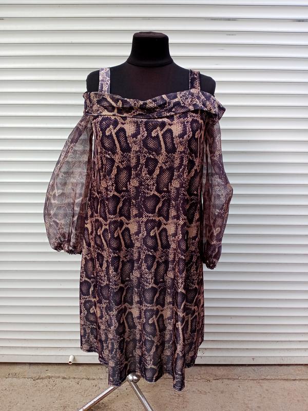 Платье Cadrelli, Турция. Свободного кроя, декольте лодочка. Рукав свободный, из прозрачной органзы, внизу на резинке. Ткань платья – 95% вискоза, на ощупь как мягонький велюр. Принт - питон. По боковым швам карманы. Размеры: 44 (на 50), 46 (на 52) и 48 (на 54).