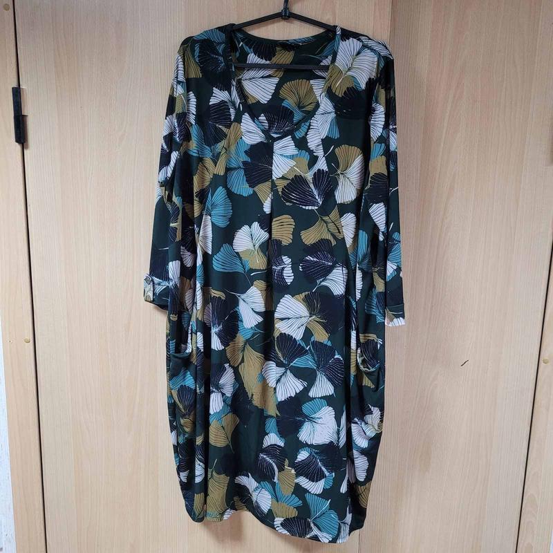 Платье из плотного холодного трикотажа с карманами,рукав 3/4,на груди встречная складка,фасон Бохо или тюльпан.На темнозеленом узоры.Новое, без бумажной этикетки.Ог 124+,Об 140+, рукав 48, Длина 100.