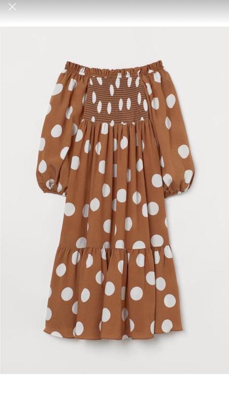 Хіт блогерів!!! Неймовірна карамельна сукня hm у горохи. Довжина міді, легка тканина, спущені плечі і красивезні рукава. Розмір xs-s. Стан чудовий!