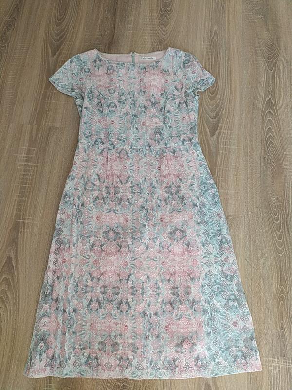 Сукня у новому стані, без слідів носіння тонка, якісна тканина, підклад - бавовна, верх віскоза; тканина дихає, ніжного кольору розмір м довжина 103 плечі 39 груди 47 талія 40 стегна 54