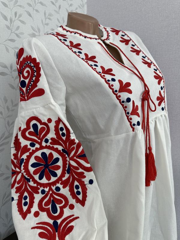 Отправляем заказ в день оформления! В наличии бело-молочная этническая вышиванка, материал хлопок + лен. Качественное платье, держит форму, объемные рукавчики. Длина миди! Размер универсальный, садится свободно. Идеально на XS-M. Замеры Длина 120 см Плечи 38 см Рукав 54 см Полуобхват талии 43 см Полуобхват груди 48 см.