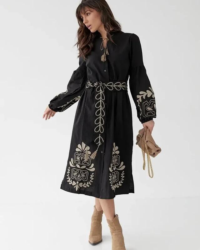 🔥Бавовняна сукня-вишиванка. Модель прямого силуэта с разрезами по бокам. Круглая горловина дополнена воротником-стойкой на завязках. Рукава с кокеткой заканчиваются манжетами на резинке. Низ изделия и рукава декорированы машинной вышивкой. Застегивается на пуговицы по переду. В комплект входит пояс из основного материала, декорированный вышивкой. 🎨 Цвет: бежевый, черный 🧶Состав 100% бавовна 🧶Материал: Бавовна ✔Размер:S,M, L Замеры⤵️ S Объем груди :100см Объем бёдер:112см Длина изделия:115см Длина рукава:74см М Объем груди :102см Объем бёдер:114см Длина изделия:115см Длина рукава:74см L Объем груди :104см Объем бёдер:116см Длина изделия:116см Длина рукава:75см 💳 Цена 1550грн Арт90241 ❗❗Для заказа и детальной информации ndем в дырэкт💌 ‼️Важно! Сбор заказа занимает 1-3дны, оплата только полная, есть обмен и возврат!!️