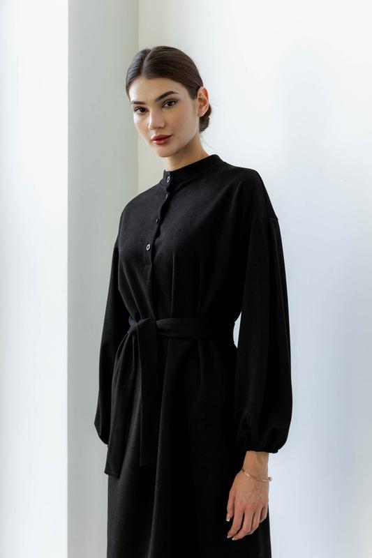 Материал - замш диагональ Цвет - черный Фурнитура - пуговицы Фасон - прямой, свободный Сезон - демисезон, весна, осень Декоративные элементы - Планка, низ рукава на резинке Конструктивные элементы - планка-склада Комплектация - платье, пояс Уход за одеждой - ручная стирка до 30° Длина изделия S-M = 106 см, L-XL = 108 см, XXL-3XL = 109 см. Длина рукава S-M = 53 см, L-XL = 53 см, XXL-3XL = 53 см