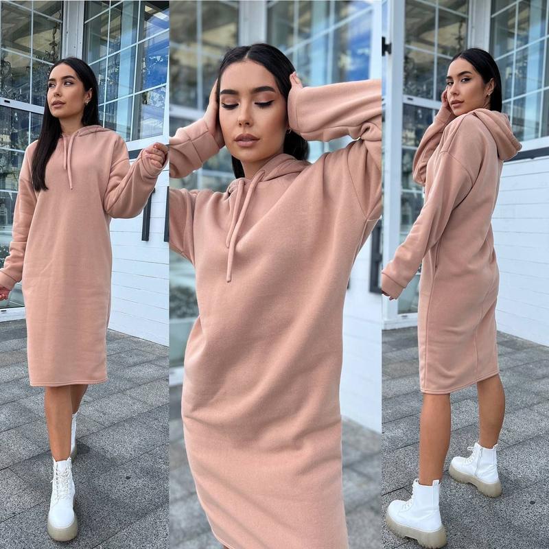 Топова Новинка 🤩 Мод :576 Теплое платье С капюшоном! Стильне, Комфортне, Мега Круте! В топовых оттенках 💓 Размеры 42-46,48-52 Ткань Теплая трехнитка на Флисе люкс 🔥 кольори -,Мокко,Черный,Беж,Трава,Малина, Электрик