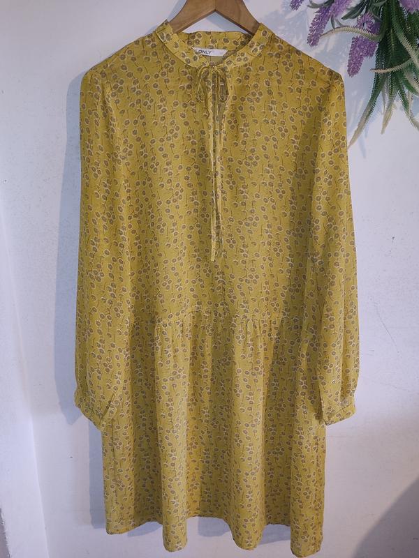 НОВА 🌞🌻🌼 Легкое летнее платье/туника из шифона желтого цвета в мелкие цветы. Крой свободный. Длинный рукав с манжетом на пуговице. Прозрачная. 👚Новая одежда без бирки в идеальном состоянии. Прекрасно подходит летом. Бренд: ONLY Размер: 42 XL Состав ткани: 100% полиэстер Полуобхват груди : 55 см; Длина: 97 см по центру передней части; Рукав: 59 см