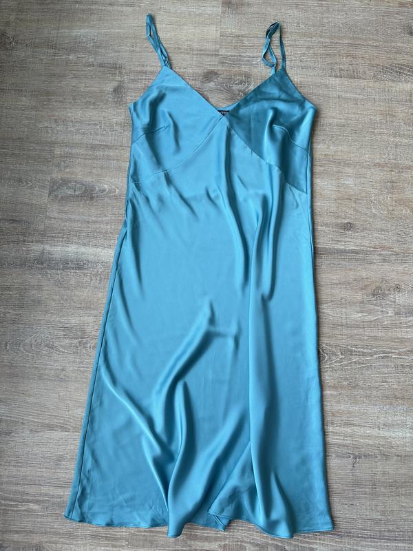 Платье в бельевом стиле, цвет тифани, размер S, форма трапеции, ткань очень приятная на ощупь и легкая. Бретели регулируются, длина 97 см. Одевала один раз, в очень красивом состоянии.