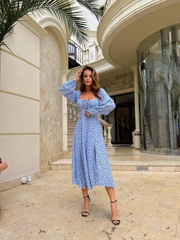 Платье миди расклешённое с пышной юбкой с декольте на кулиске с длинными рукавами фонарика...