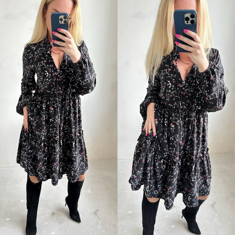 Сукня Модель 018 Размеры: 42-44,46-48,50-52 Ткань: шелковый софт Цвет: темный синий в белый горошек, молочные цветы, черные цветы, черный горошек ✔️Платье в стиле оверсайз, свободного кроя, воротник стойка В наличии на выходные ионок