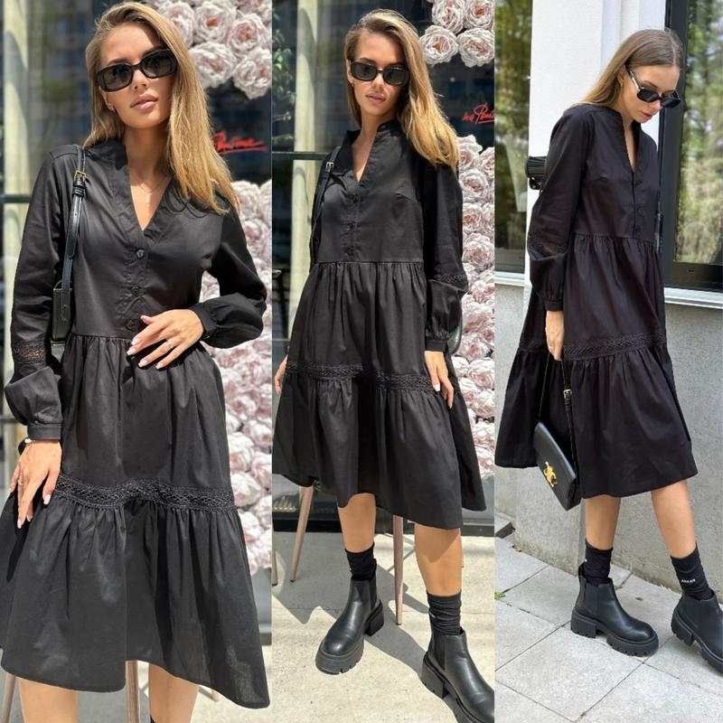 Сукня арт. pani. 455 Платье-трапеция из натурального коттона свободного кроя. Модель с V-образным вырезом, рукава и воланы декорированы кружевом. Ткань: 100% котон Цвет: черный Размеры: S, M, L, XL