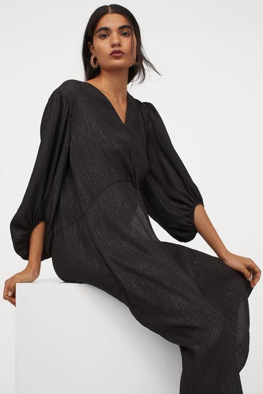 Сукня вільного фасону, довжиною міді. Модель виготовлена із жатої тканини із вторинно переробленого поліестеру. Виріб з V-подібним вирізом горловини та пришитим запахом спереду. Довгий пишний рукав із вузькою закритою гумкою на манжетах. Відрізна лінія стегон та злегка розкльошена спідниця. Без підкладки. • Бренд: H&M • Країна: КНР • Колір: Чорний • Візерунок: Однотонний • Стиль: Кежуал • Фасон: На запах • Довжина виробу: Міді та нижче коліна • Довжина рукава: Довгий • Фасон рукава: Вшитий • Застібка: Без застібки • Тканина: Чорна з блиском СКЛАД: 100% поліестер • Сезонність: Всесезонна На бірці вказано розмір: М / але підійде на розмір: Л ( український: 48 ) Пог - 50/53 см Пот - 53 см ( фасон вільний ) Бедра Поб - 54/57 см Довжина рукава - 53/55 см Довжина виробу - 123 см