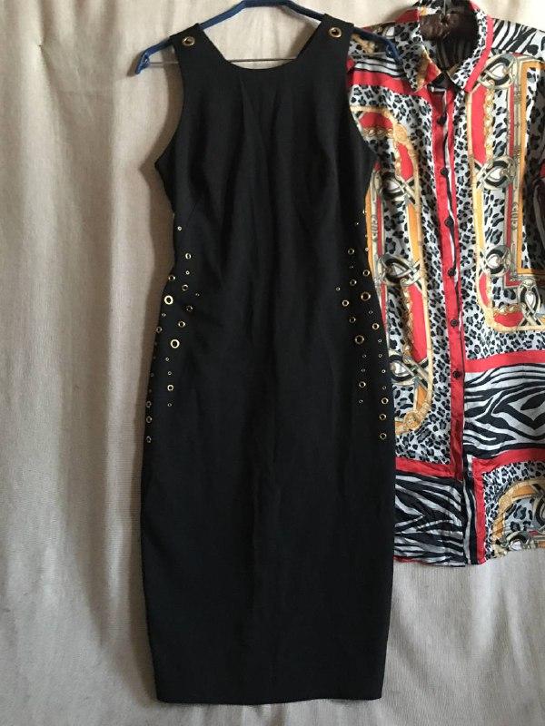 Цвет черный, фурнитура золотистого цвета, Платье полностью на чехле. Ткань плотная, эластичная. Застежка на длинную молнию сзади. Длина 108 см, плечи 32 см, ПОГ 44 см, ПОТ 36 см, ПОБ 46 см, ПО низу 38 см