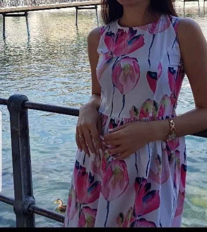 Платье от украинского производителя с цветами в размере S Длина 95см Полуобхват груди 44 Полу обхват талии 38 Есть дефект: разошлась молния, надо ее заменить.