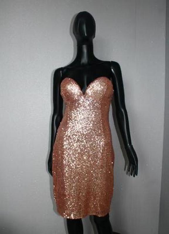 Люкс, розкіш. Шикарна сукня, пайетки пришиті. Дуже красивий колір бронза-шампань. Нове, стало велике на 2 розміри, пролежало не вдягнувшист, розмір вказаний 14, на наш М-Л, орієнтуйтесь на заміри. Плаття стрейчове, тягнеться, сяде в обтяжку по фігурі. Плотна чашка, по колу навкруги бюста та спинки -тримається на силіконовій смужці. Довжина- 83 см. ПОГ 48-52 см. ПОТ 43-44 см ПОБ 52-54 см.