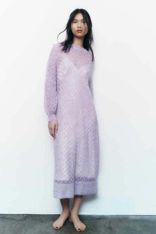 Оригінал з оф сайту Сукня ажурна міді з круглим вирізом та довгими об'ємними рукавами. Манжети, підкладка. Сукню-підклад можна носити окремо як slip dress В наявності розмір xs-s Верх: Плечі спущенні 69 Пог 67 Бедра 60 Довжина 123 Рукав 39 від підмишки Низ: Пог 44+ Під грудьми по шву 41-45 Талія 39 Бедра 50 Довжина 118 Xs-s Склад : 10% шерсть 45% поліестер 45% поліамід Підклад : 96% поліестер 4% еластан