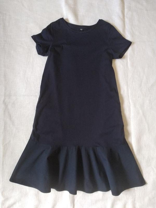 Платье Uniqlo. Длина средняя. Основная часть платья выполнена из материала футболки, низ выполнен воланом (материал в виде рубашка). Цвет приглушенный синий. Имеет карманы по бокам. 100% бавовна. Размер S. Длина - 98 см, Плечи - 33,5 см, Рукав - 18 см, Пог - 44,5 см, Высота именно волана - 23,5 см.