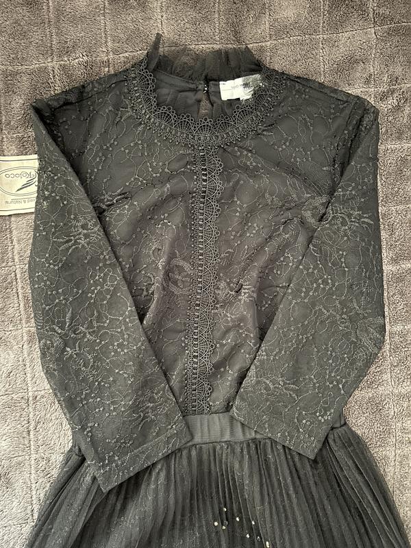 красивый кружевной верх, шифоновый низ, на подкладке пришиты камешки, рукав 3/4 Одягала один раз
