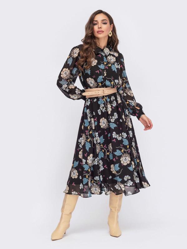 Шифоновое платье-рубашка черное миди в цветочный принт с эластичной деталью в поясе. Модель дополнена декоративными пуговицами вдоль планки. Застегивается на пуговицы сзади у горловины. Пояс в комплект не входить. Материал/состав: шифон (100% полиэстер); Состав подкладки: 100% хлопок; Растяжимость: нет; Длина изделия: 121 см; Длина рукава (от плечевого шва): 60 см; Параметры модели: 85х61х92, рост 170 см; На модели представлен 44 размер. ❗ Все заказы оформляются только через ЧАТ, через кнопку КУПИТЬ ➡️ отклонены. Страна производитель ➡️ Украина. 🚛 Доставка ➡️ "Новой почтой" (2-3 рабочих дня). Доставка сплачивает покупатель. 👛 Оплата ➡️ 100% Передача на р/р ФОП "ПриватБанка" или после платья с авансом. Если посылку не забираете, аванс возвращаем по учету транспортных расходов в обе стороны. 📦 🔁 Обмен и возврат ➡️ за счет покупателя, при наличии оригинального и невредимого упаковки и ярлыков, отсутствия следов эксплуатации, стирки и ношения.