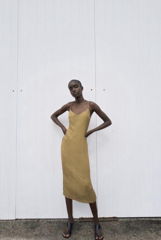 Сукня з відкритою спиною в кольорі хакі від бренду Zara. Білизняний стиль
