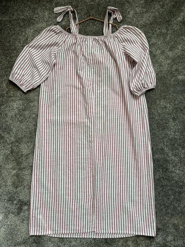 Легкое летнее женское платье в полоску. Рукава на резинке можно носить несколькими способами: на плечах или приспущены. 100% хлопок. Длина - 85см Длина рукава - 34см Полуобхват - 50см