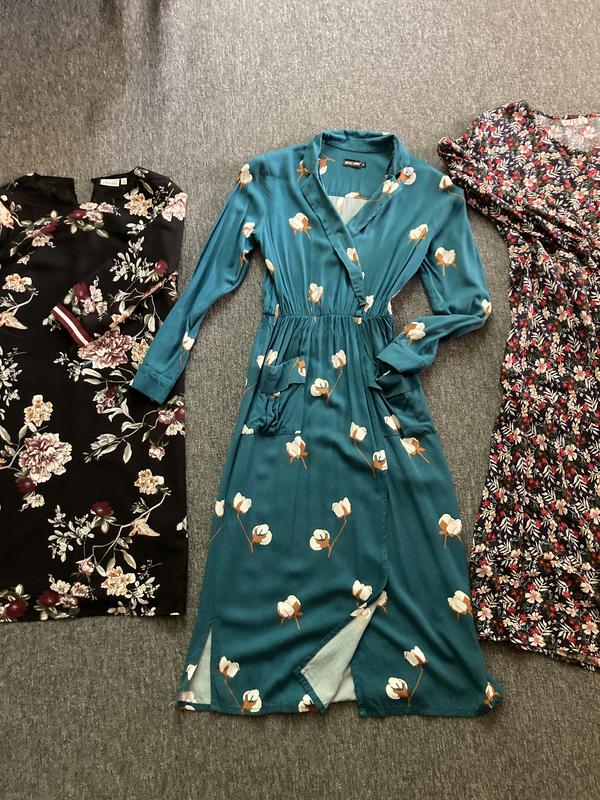 Очень красивые платья. Все размера XS-S. Темная бирюзовая на фото засветленный немного цвет 380. В цветы миди 200. Более короткая по колено 300. Если покупаете все блуза фудболка в подарок. И цена всего 800