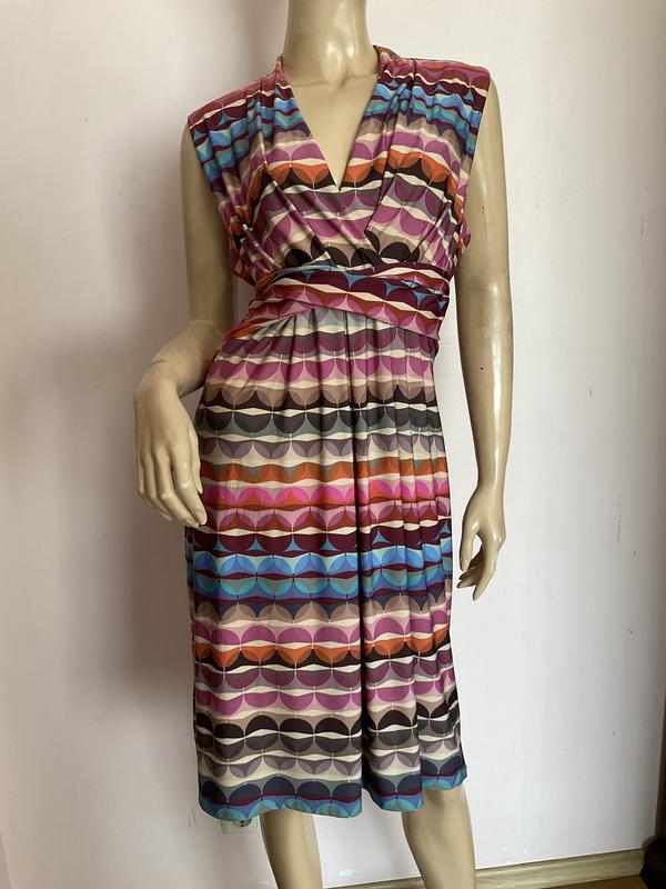 Симпатичный принт. На подкладке. Тканина не тонка. Без дефектов. Замеры в груди 55-58 см в талии 49-53 см от плеча до линии талии 34 см немного завышена. В бедрах 63-66 см длина 102 см 13:9:23