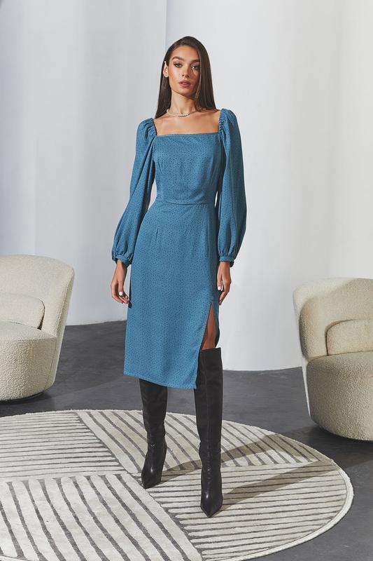 Платье с квадратным вырезом и боковым разрезом VOVK Фасон - до колена Цвет - принты и узоры; синий Материал - плотный штапель Сезон весна-лето Состав - 85% хлопок, 15% вискоза Стиль - повседневный