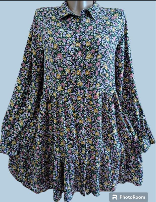 Пог 50(💯) см, длина 85 см,рукав от воротничка 70 см, свободна свободно,очень приемное на ощупь и к телу 💯% вискоза, по переду на пуговицах, красивый цветочный принт, по низу валан.