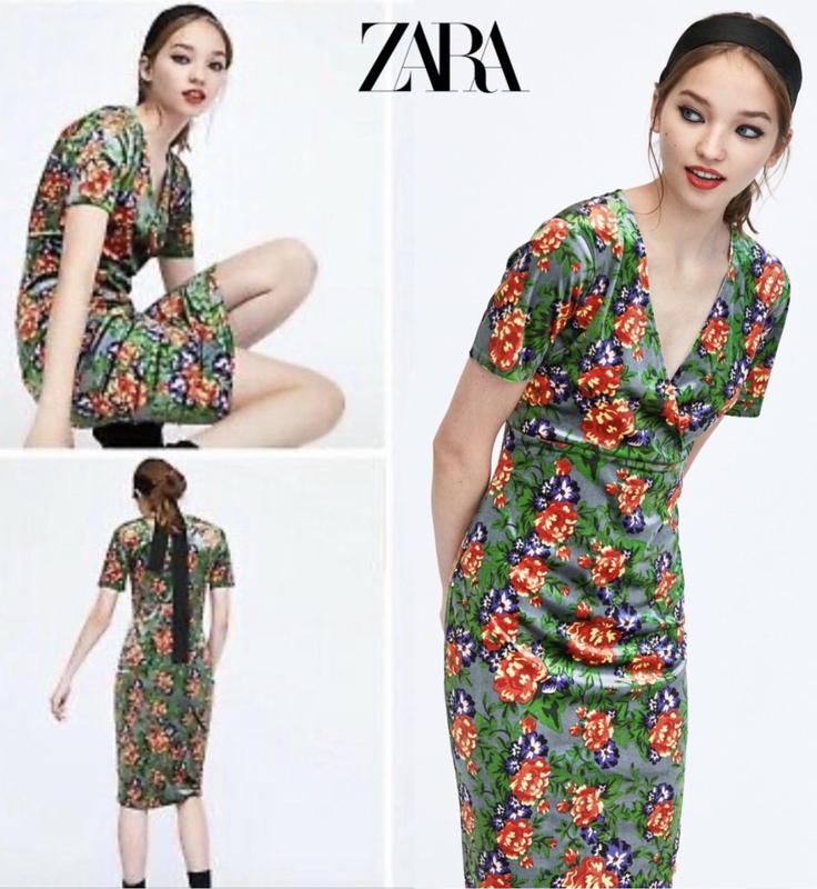 Бархатное платье миди с v-образным вырезом запахом и цветочным принтом zara trafaluc