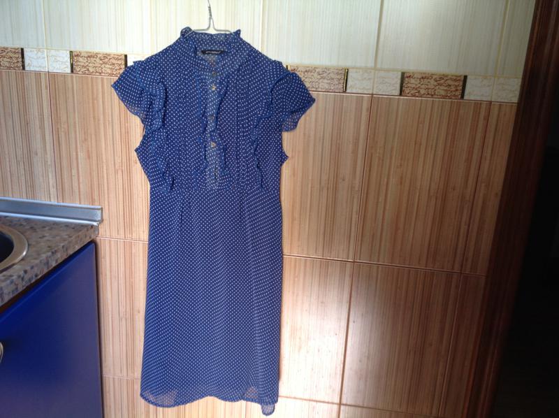 Платье шифоновое синего цвета в белый горох.Пояса нет,есть петли в которые можно вставить любой ремень или пояс.Впереди и сзади в верхней части платья небольшие рюши.Коричнево-перламутровые пуговицы в форме сердечек (на фото).Сбоку слева есть молния.Платье очень нежное и элегантное.ПОГ 43 см,ПОТ 34 см,длина изделия по спине 90 см.Смотрите мои другие объявления.